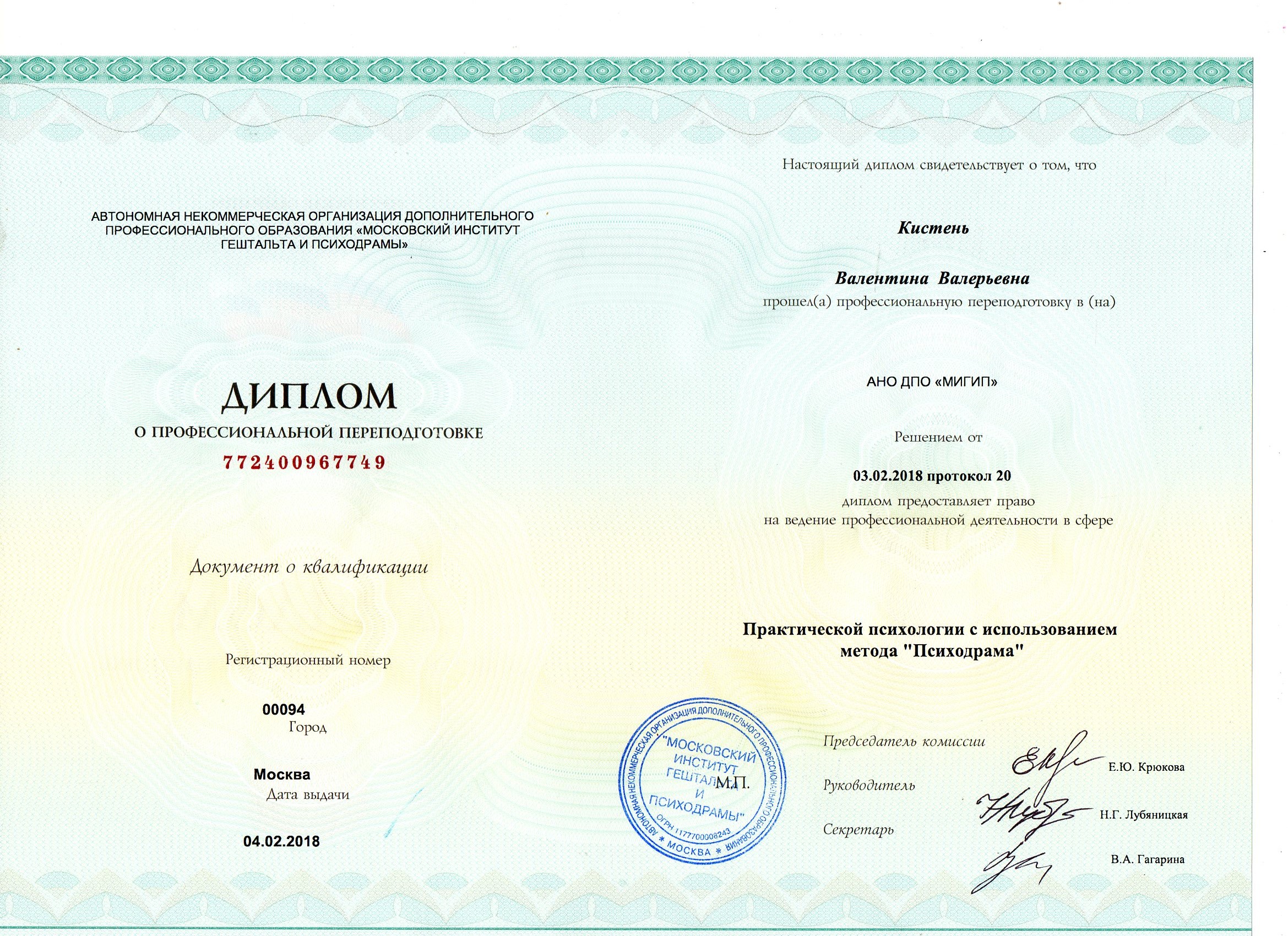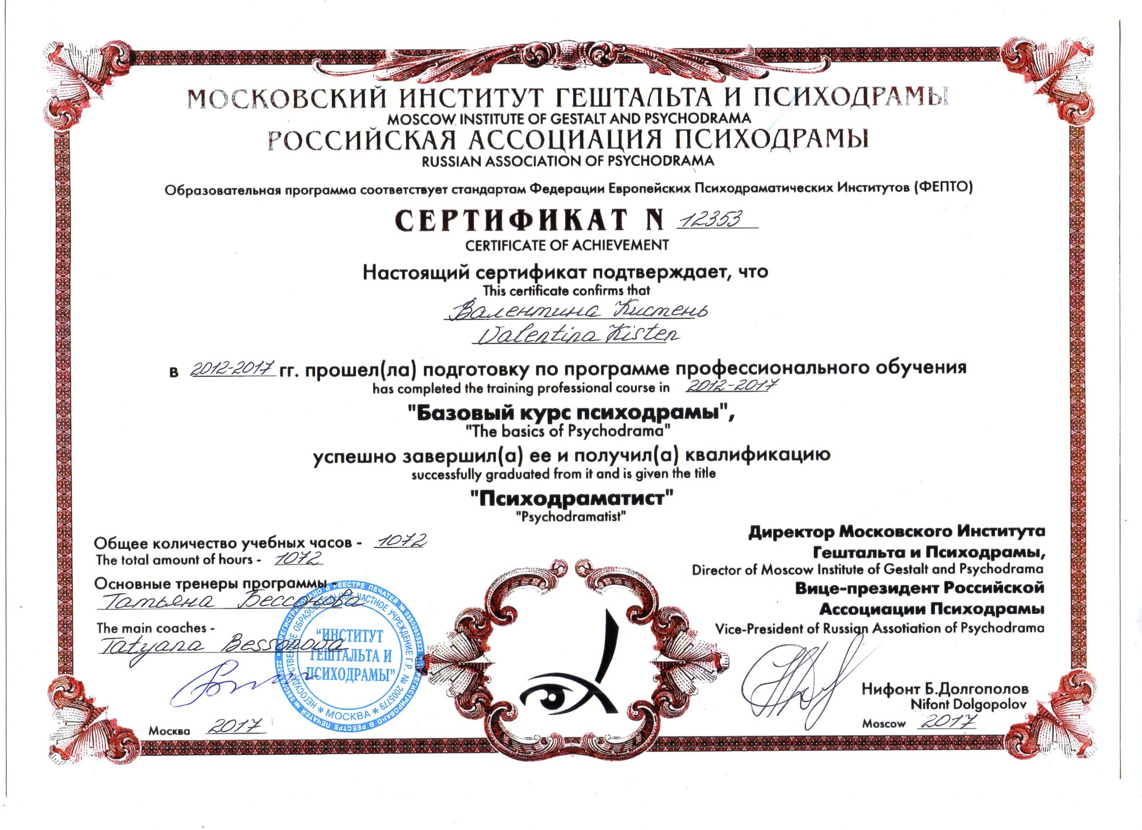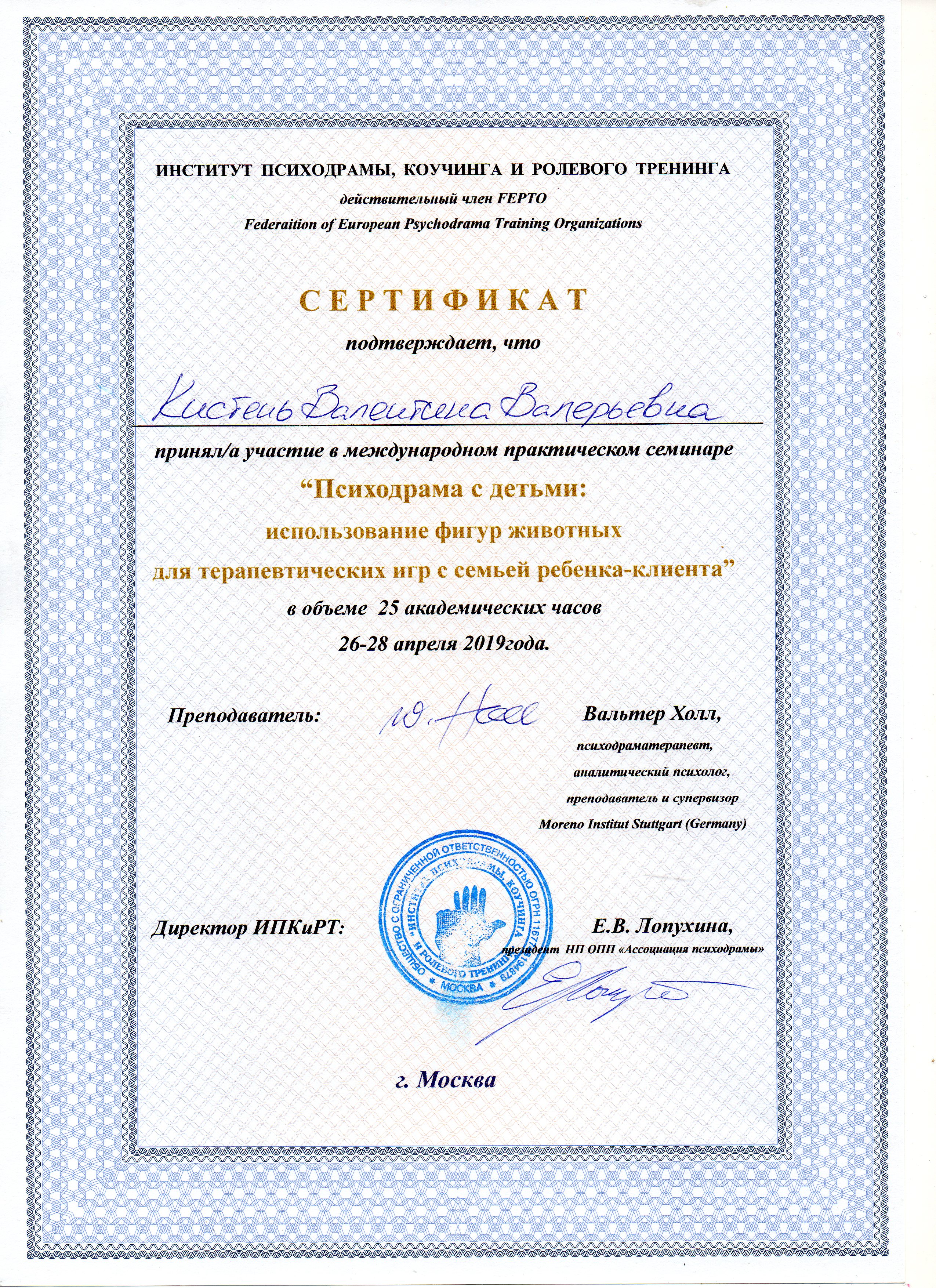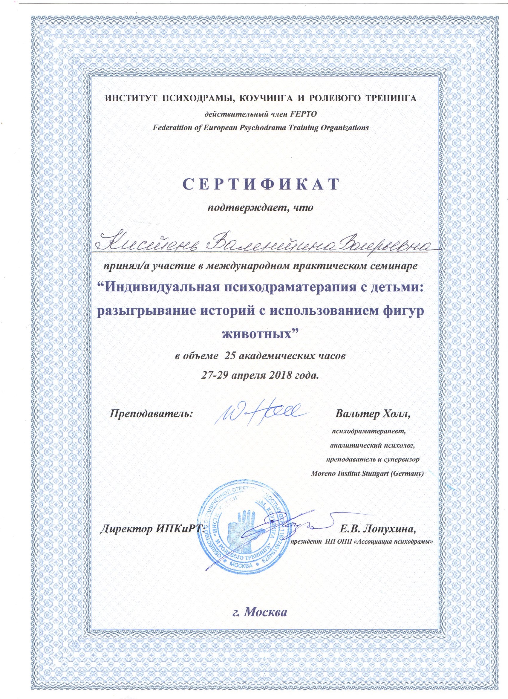 - Курс профессиональной переподготовки психодрамы в институте Московском институте гештальта и психодрамы с квалификацией "Психодраматист"