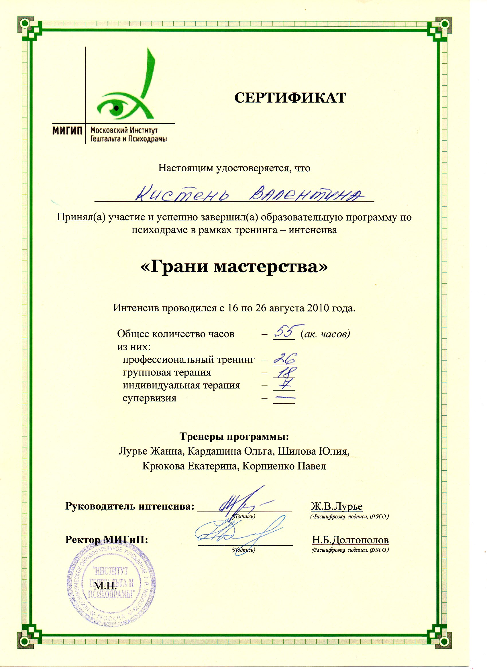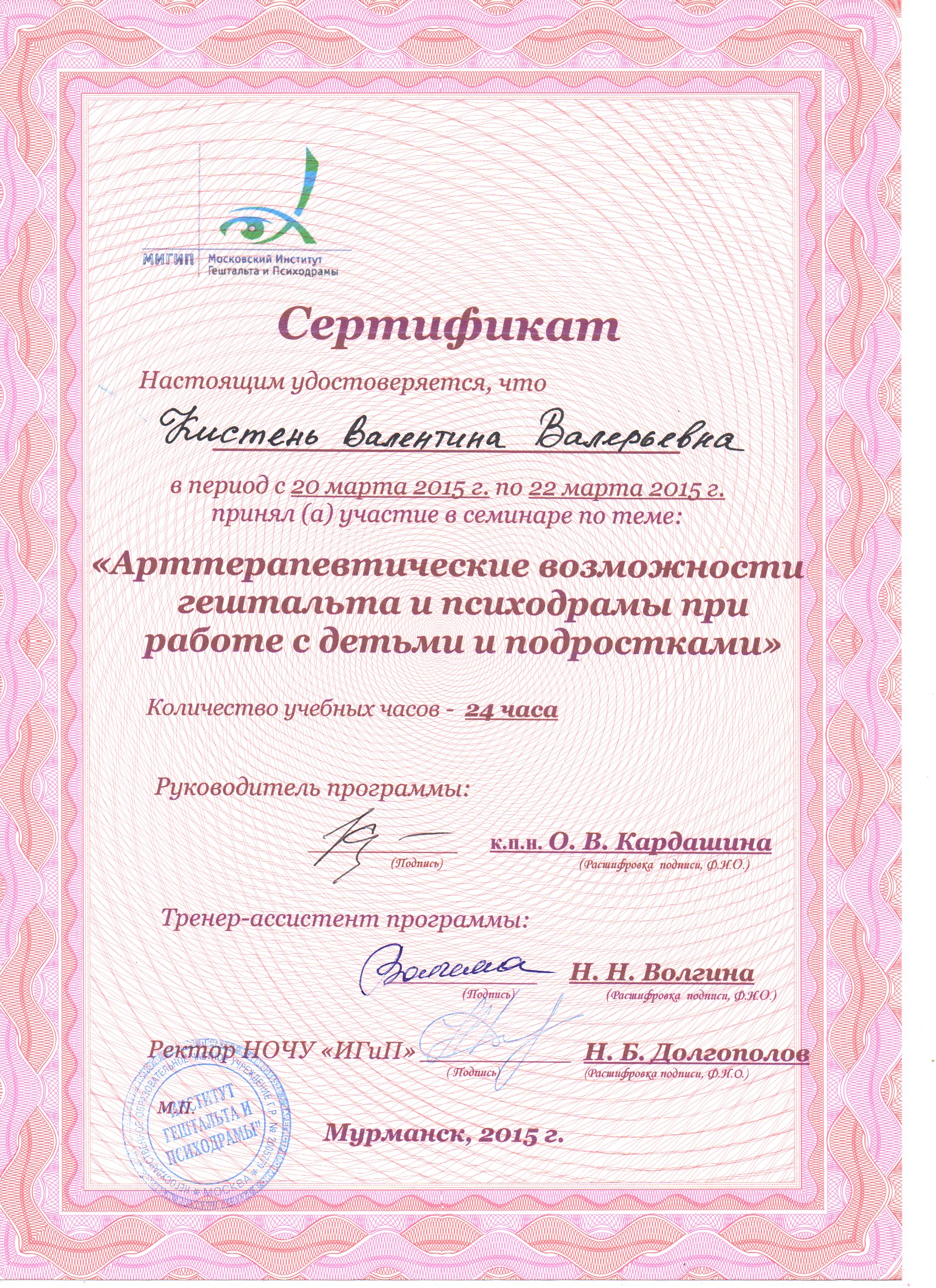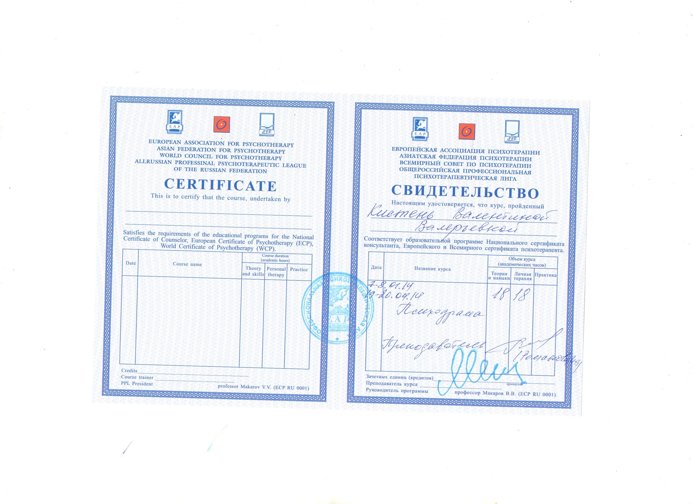 - Курс профессиональной переподготовки психодрамы в институте Московском институте гештальта и психодрамы с квалификацией "Психодраматист"