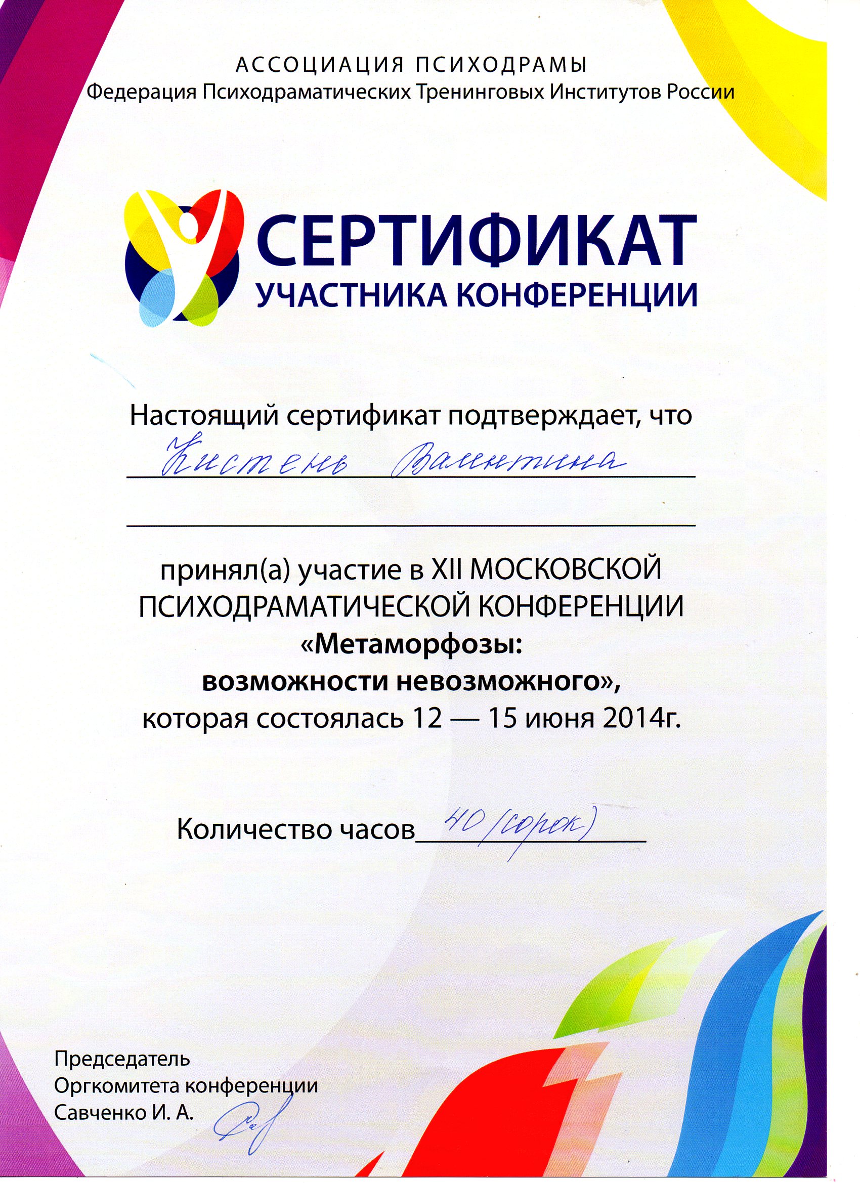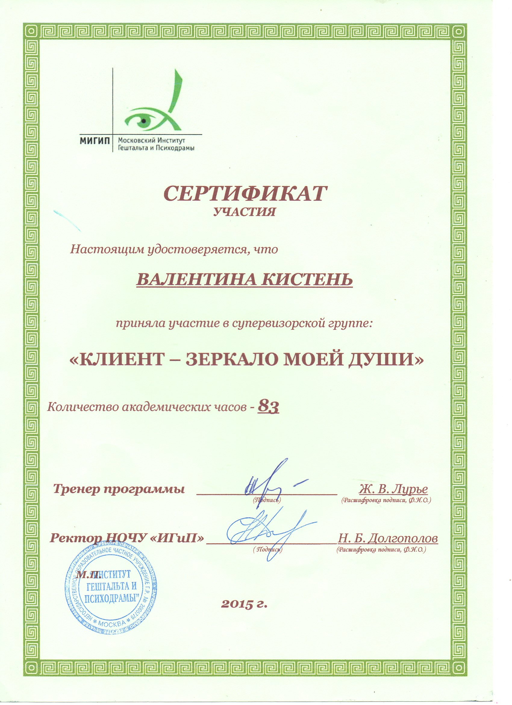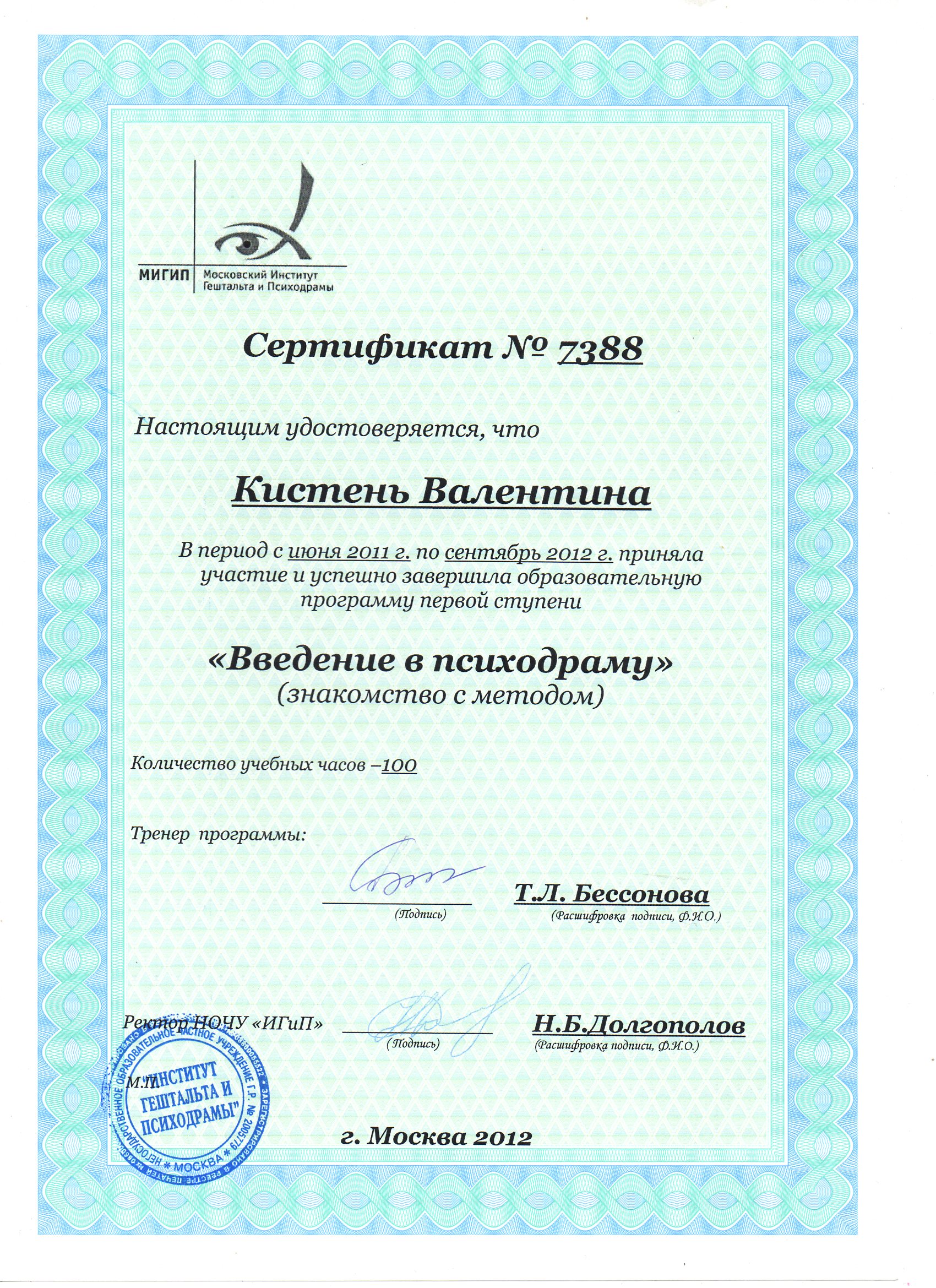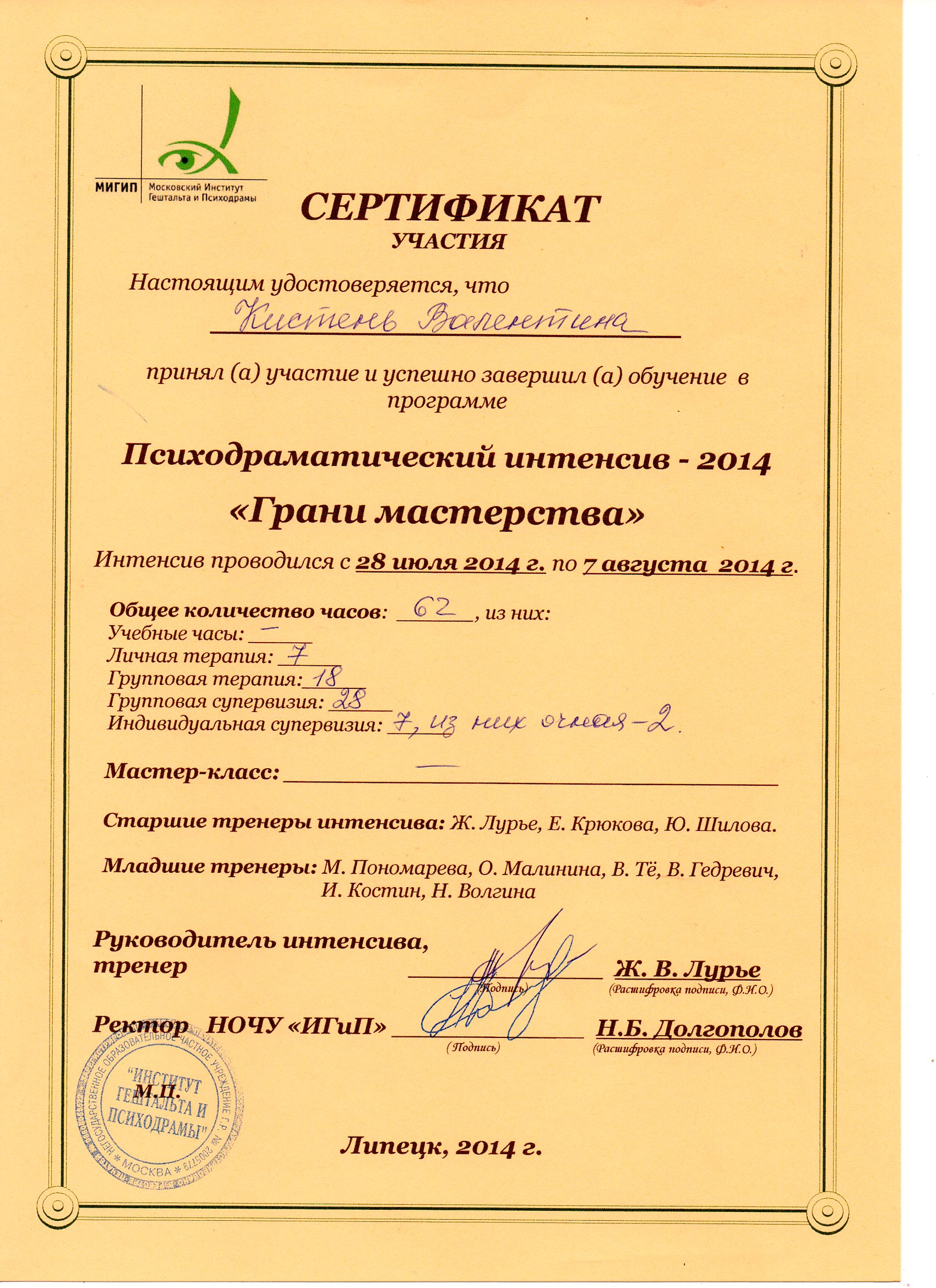 - Курс профессиональной переподготовки психодрамы в институте Московском институте гештальта и психодрамы с квалификацией "Психодраматист"