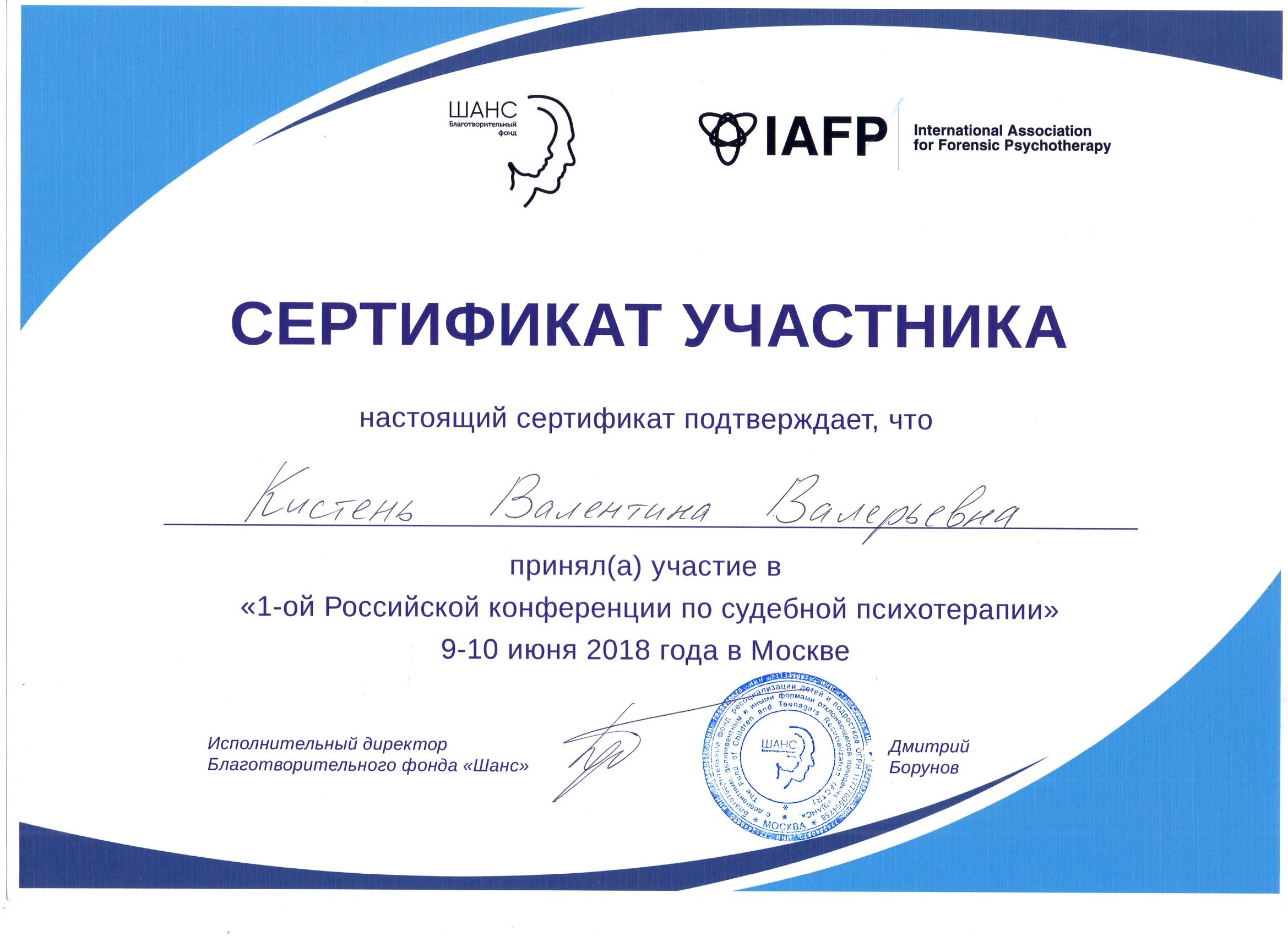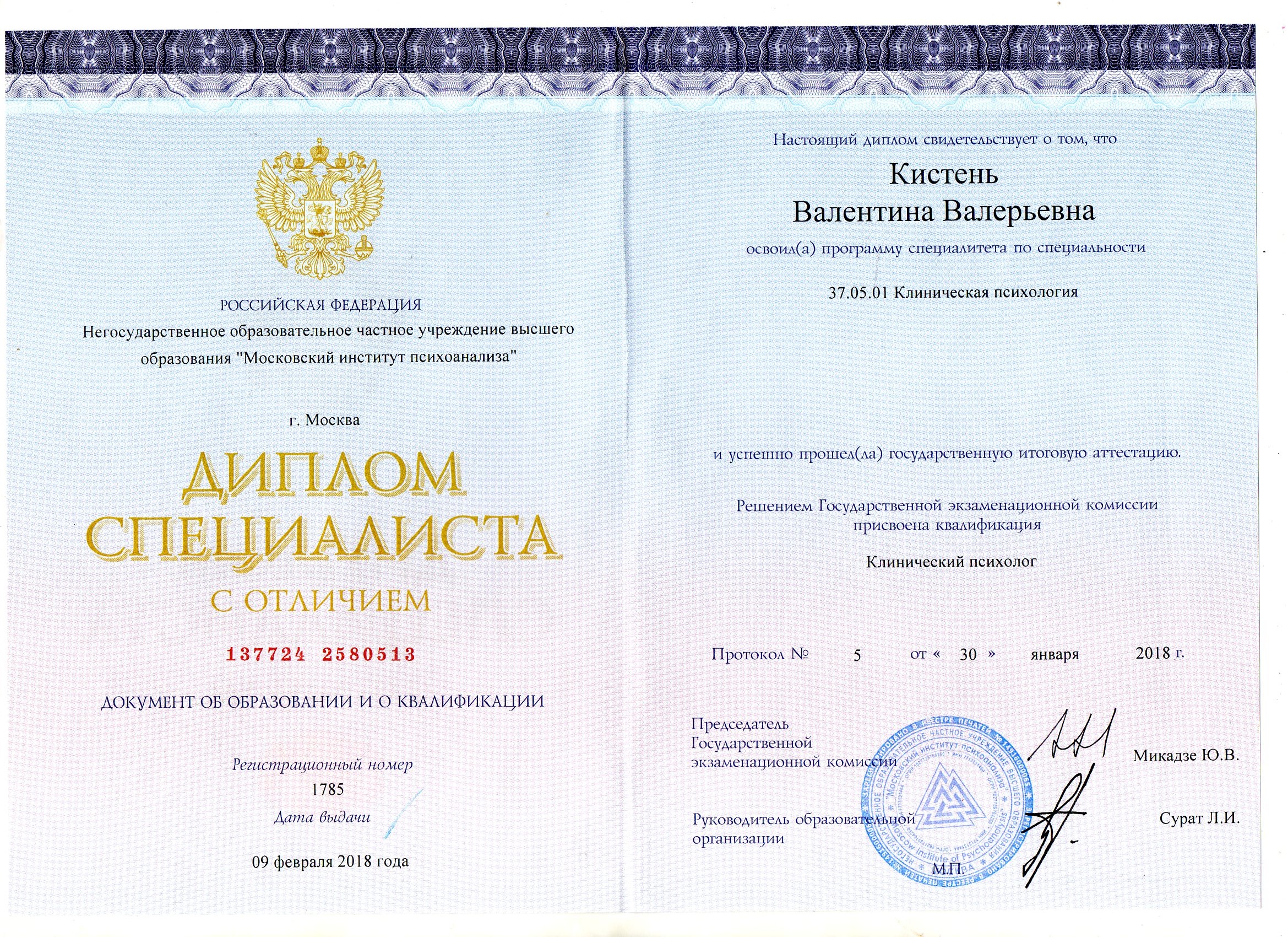 - Московский Институт Психоанализа с отличием. Клинический психолог по специализации: патопсихологическая диагностика и психотерапия