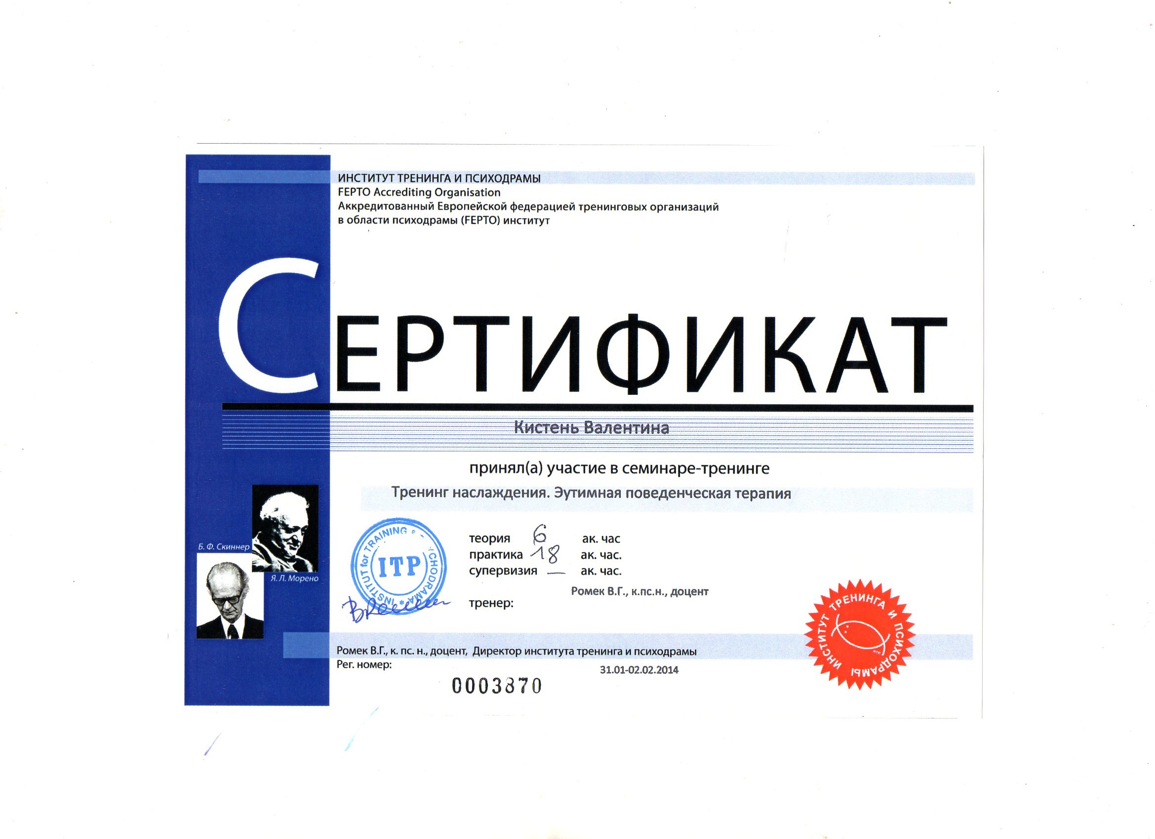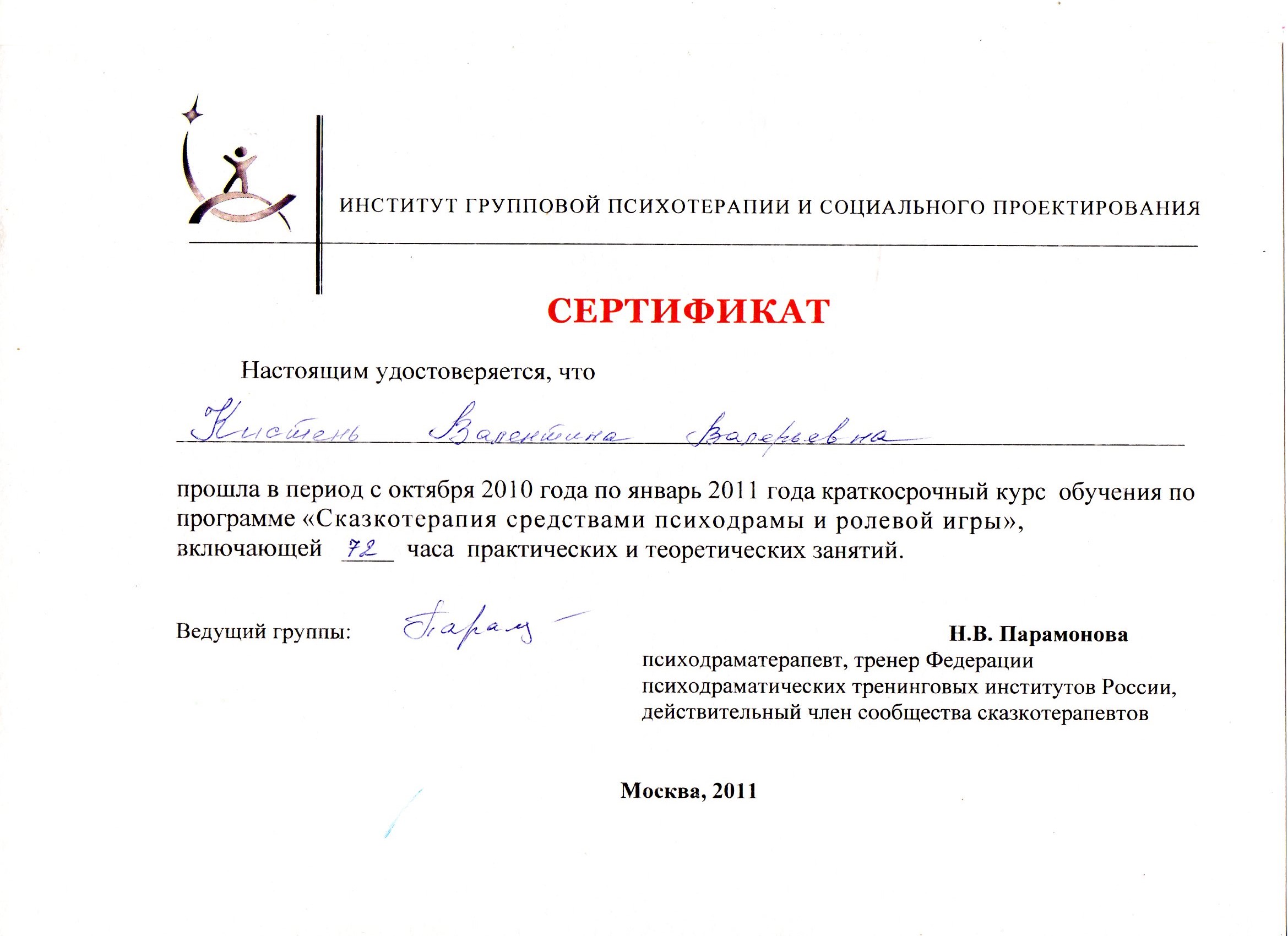 - Курс обучения по программе «Сказкотерапия средствами психодрамы и ролевой игры» (Институт групповой психотерапии и социального проектирования)