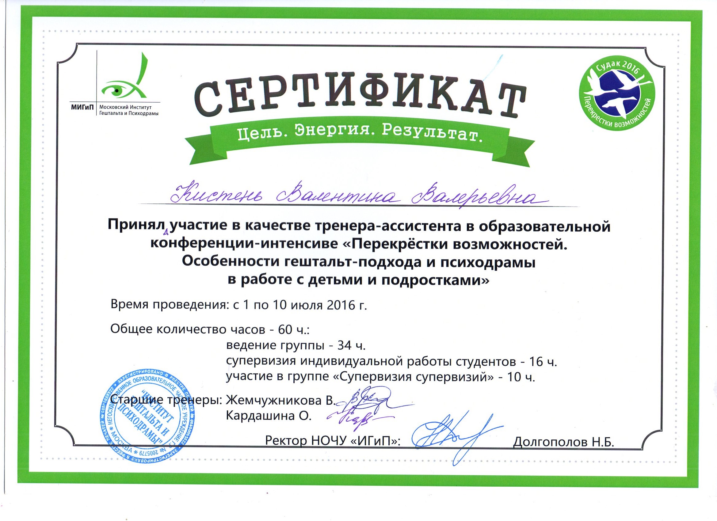 Тренер-психолог подростковых групп детских выездных интенсивов Московского института гештальта и психодрамы;
