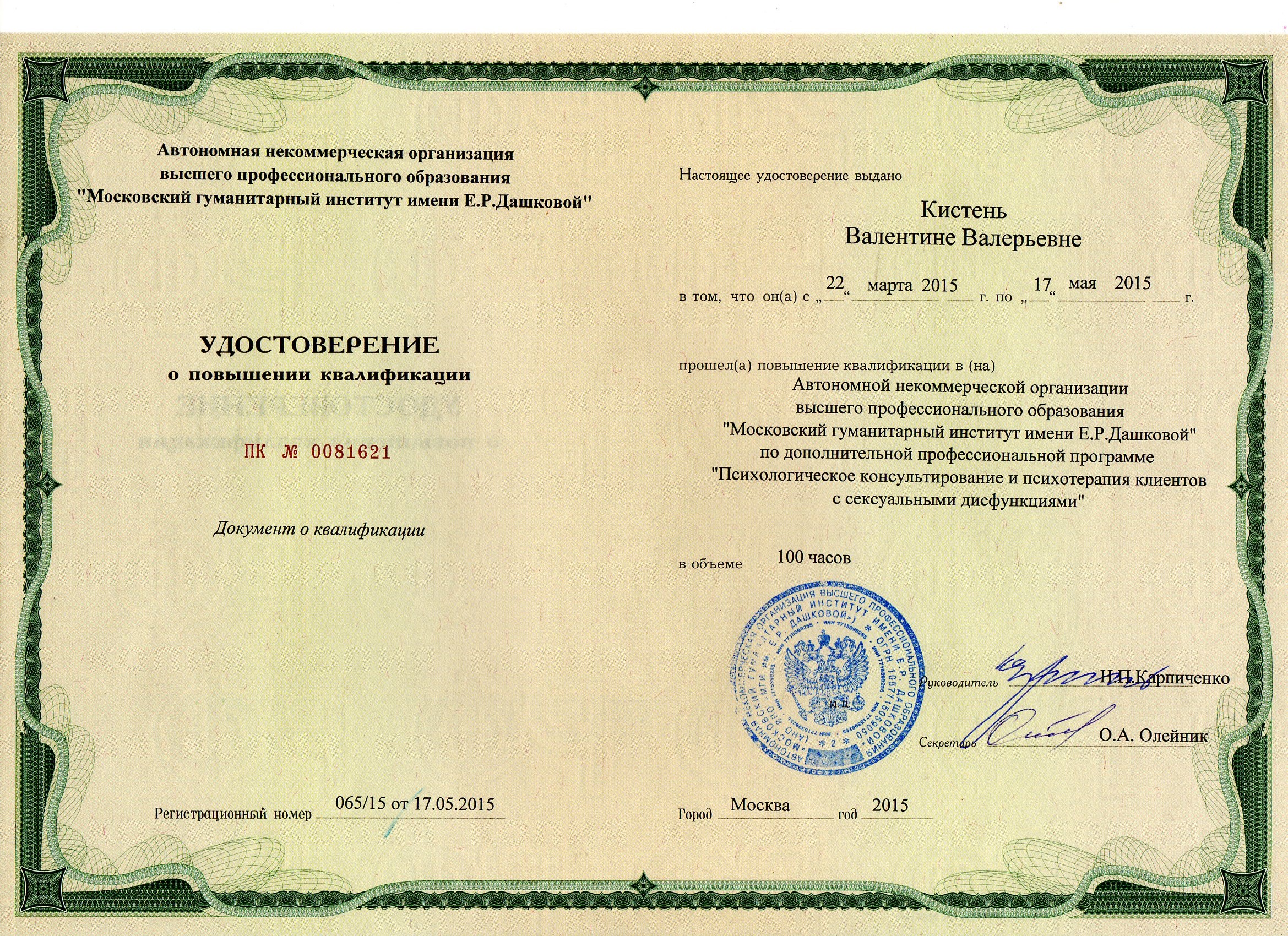- Курс повышение квалификации «Психологическое консультирование и психотерапия клиентов с сексуальными дисфункциями» (Московский гуманитарный институт имени Е.Р.Дашковой)