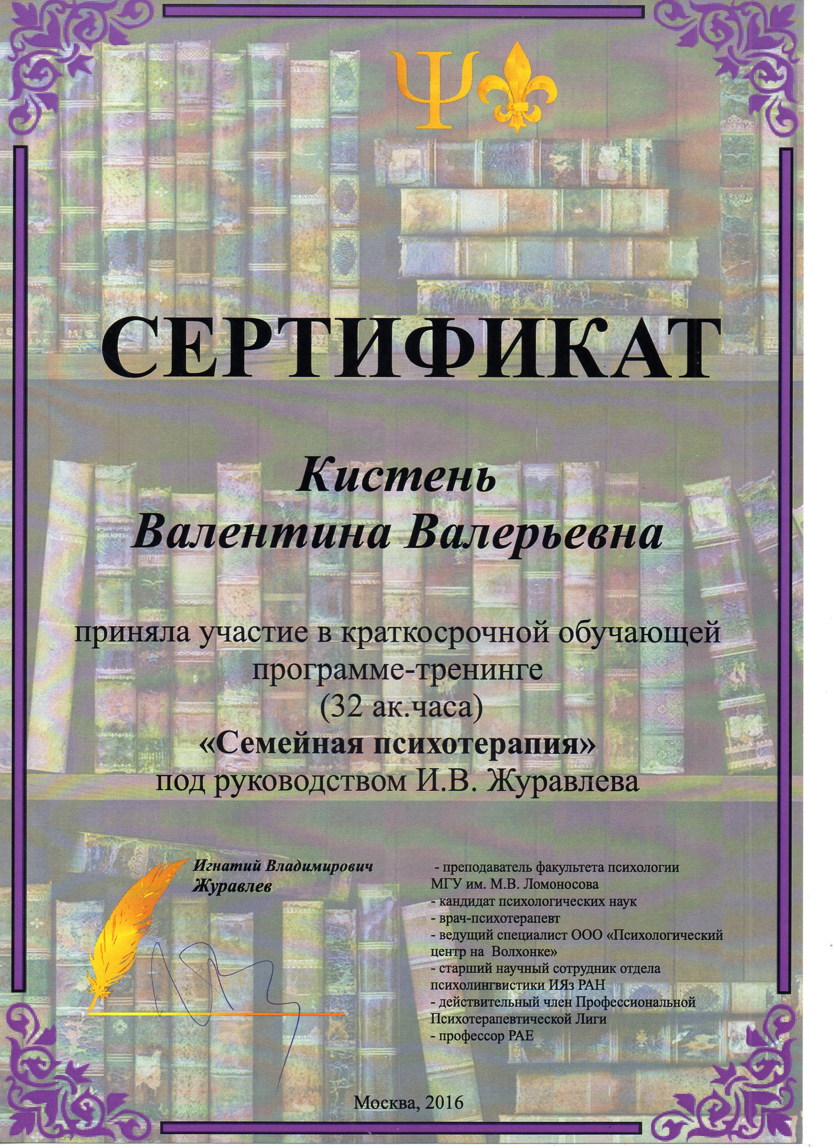 - Обучающая программа-тренинг «Семейная психотерапия» (под руководством врача-психотерапевта И.В. Журавлёва)